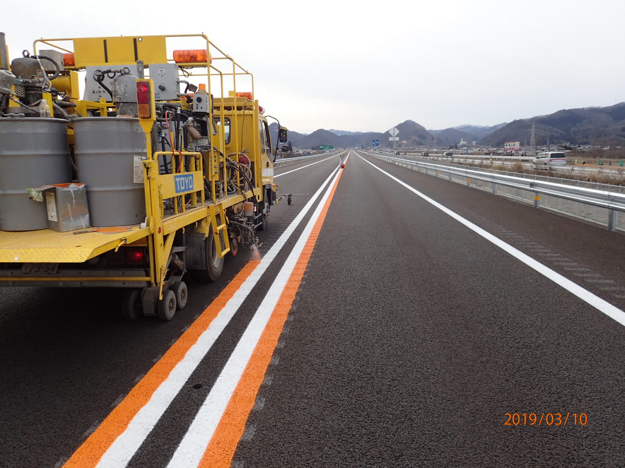 JIS規格(JIS K 5665)1種(常温型)または2種(加熱型)に分類され、反射材であるガラスビーズを含有しない、溶剤型の塗料です。マーカー車によるエアスプレー塗装が主流ですが、常温型はローラー施工も可能です。塗装直後にガラスビーズを散布して夜間視認性を確保します。