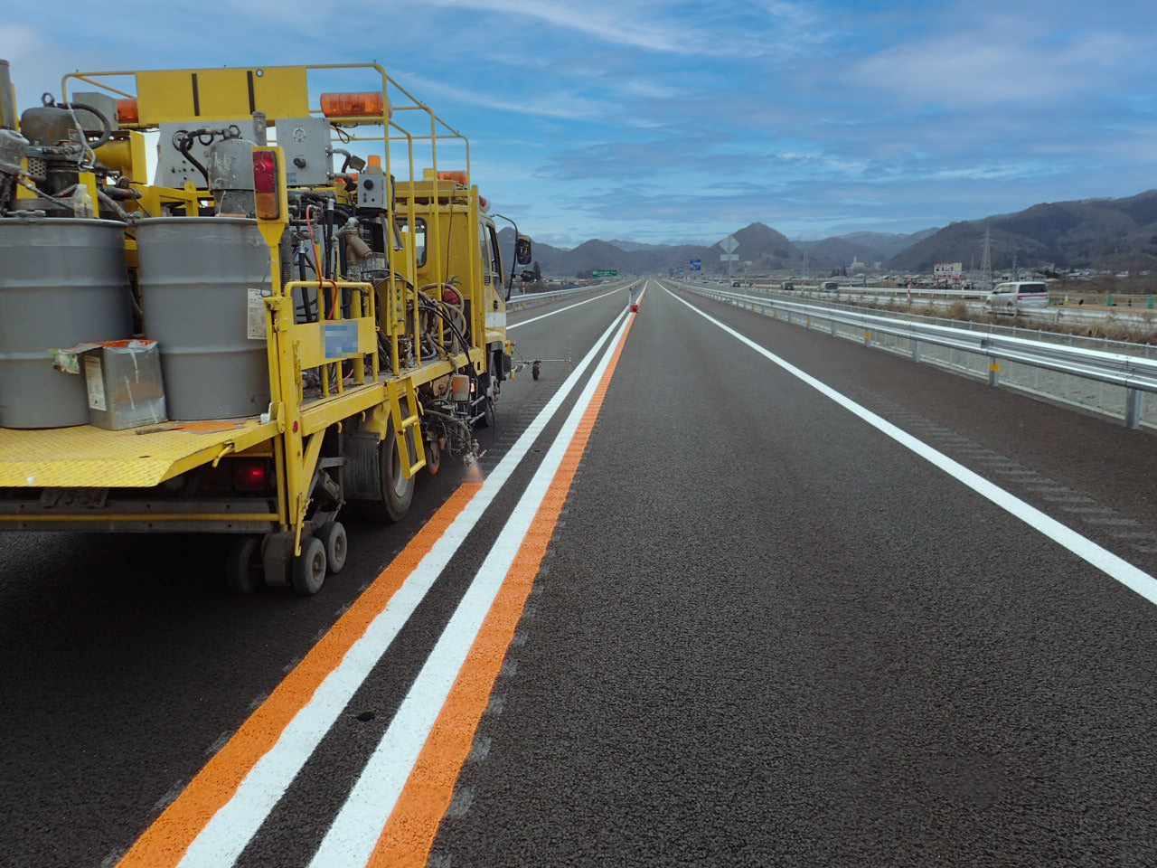 JIS規格(JIS K 5665)1種(常温型)または2種(加熱型)に分類され、反射材であるガラスビーズを含有しない、溶剤型の塗料です。マーカー車によるエアスプレー塗装が主流ですが、常温型はローラー施工も可能です。塗装直後にガラスビーズを散布して夜間視認性を確保します。