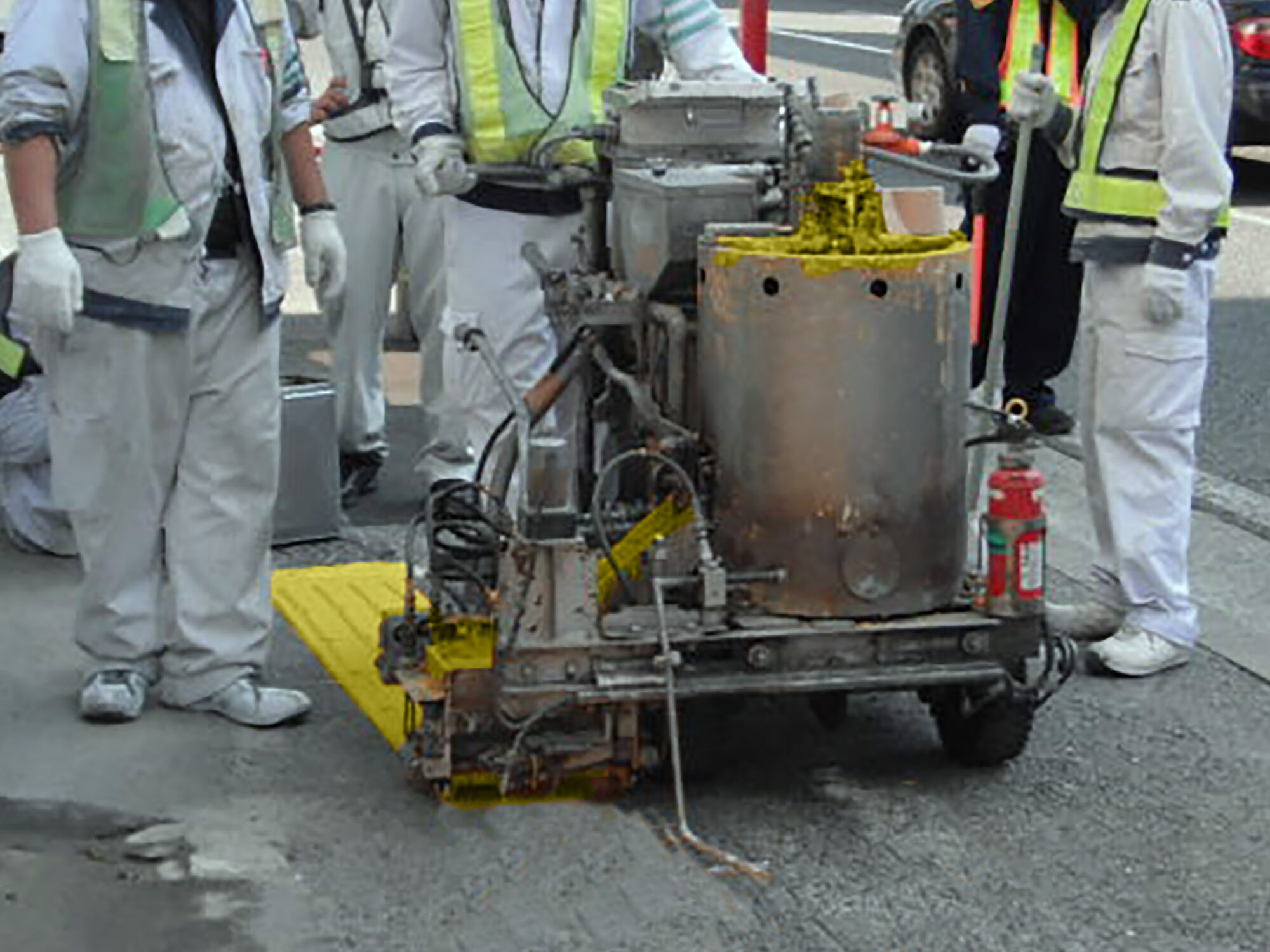 高輝度路面標示材「バイブラライン」を改良した溶融型材料を専用施工機で施工する視覚障がい者誘導標示です。