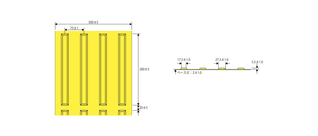警告標示(点状)部分は別工法の施工が必要になります。また、専用施工機を使用しますので、狭い歩道では施工できない場合があります。