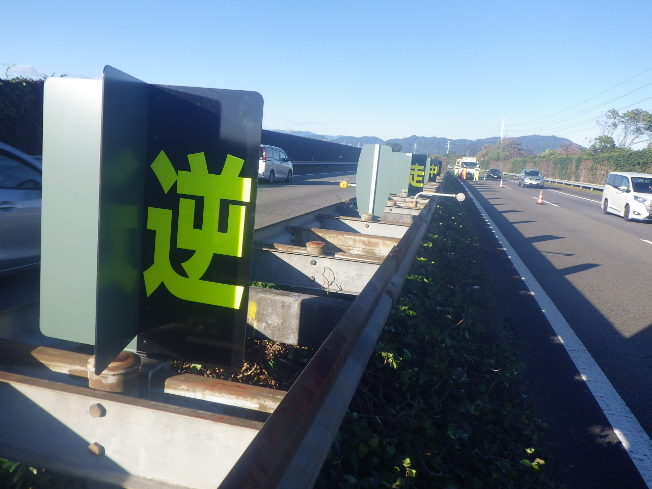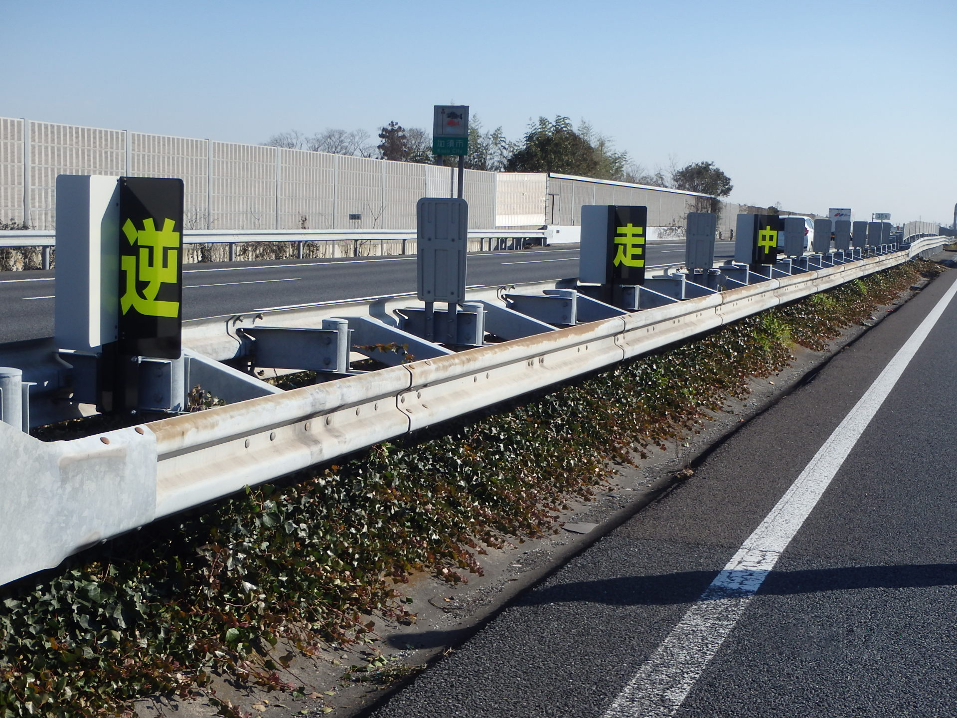 逆走車は中央分離帯側を逆走することが多く、防眩板と兼用できることで、より認知効果を高めます。